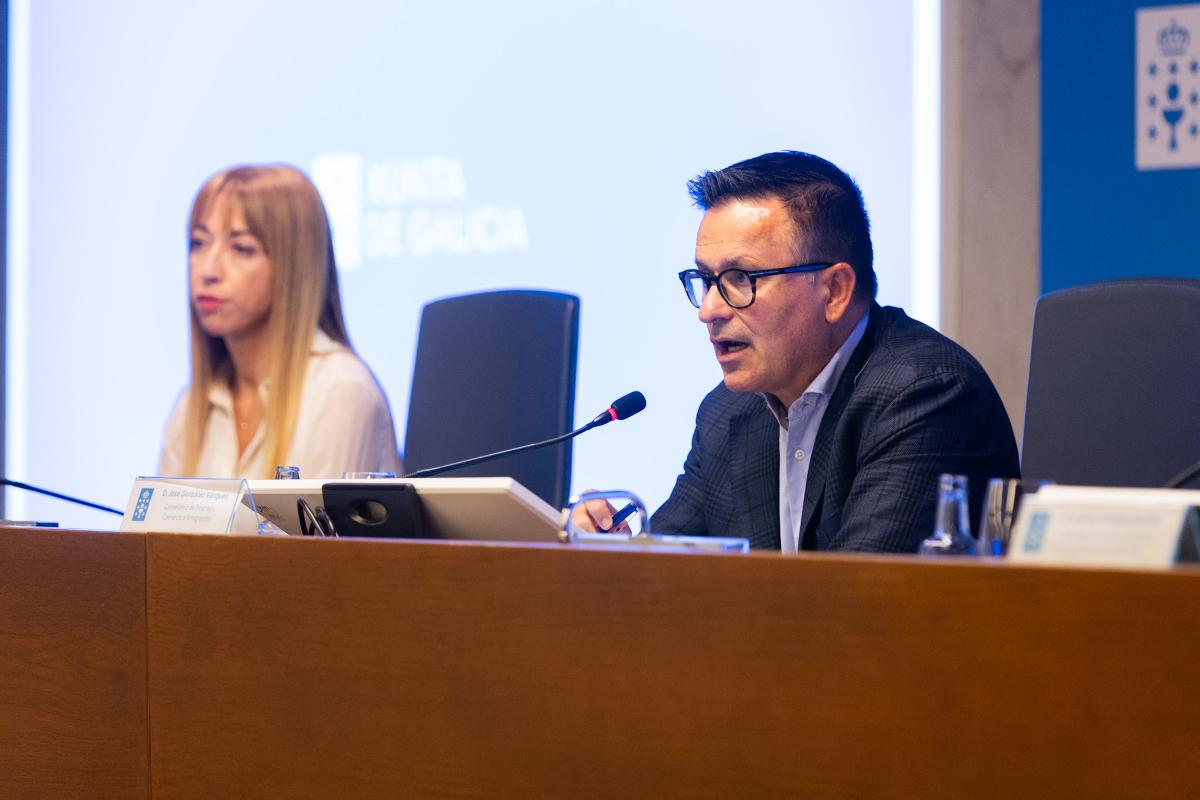 O conselleiro de Emprego, Comercio e Emigración, José González, acompañado pola directora xeral de Formación e Cualificación para o Emprego, Zeltia Lado, e polo director do Centro de Novas Tecnoloxías de Galicia (CNTG), Carlos Vázquez, participou hoxe no acto de presentación da oferta formativa que se impartirá neste centro durante o presente curso 2025-2026 e que ten como obxectivo dar resposta á alta demanda de talento especializado nun sector que cualificou como estratéxico. Nesa liña, destacou que o esforzo orzamentario no CNTG elevouse dos 2,1 aos 2,7 M€ para posibilitar unha programación que se incrementa ata os 141 cursos con 2.706 prazas. Unha suba que no caso das horas formativas acada mesmo o 31,5 % de aumento: 7.578 horas, fronte ás 5.760 do curso 2024-2025.