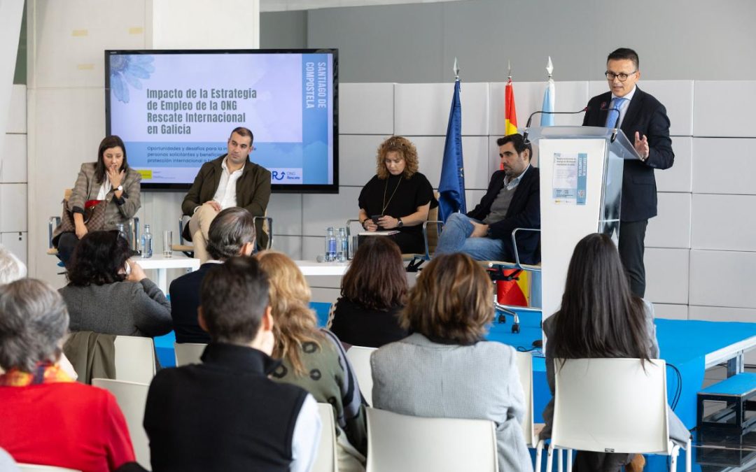 O conselleiro de Emprego, Comercio e Emigración, José González, acompañado pola directora xeral de Formación e Cualificación para o Emprego, Zeltia Lado, e polo director xeral de Inclusión Social, Arturo Parrado, clausurou hoxe a xornada Oportunidades e desafíos para a integración de persoas solicitantes e beneficiarias de protección internacional a través do emprego organizada pola ONG Rescate Internacional, onde puxo de relevo a colaboración con esta entidade no marco do pioneiro programa de arraigamento para a formación dirixido a migrantes en situación irregular que, sumando os resultados das dúas edicións, terá acadado ao remate do ano a regularización dunhas 280 persoas a través da capacitación para un emprego de calidade, ao tempo que se cubriron vacantes laborais no tecido produtivo galego. Así o dixo o conselleiro nunha intervención na que aproveitou para trasladar ao Goberno central demandas como que rectifique e atenda ás microcredenciais como unha ferramenta clave para a inserción sociolaboral das persoas migrantes.