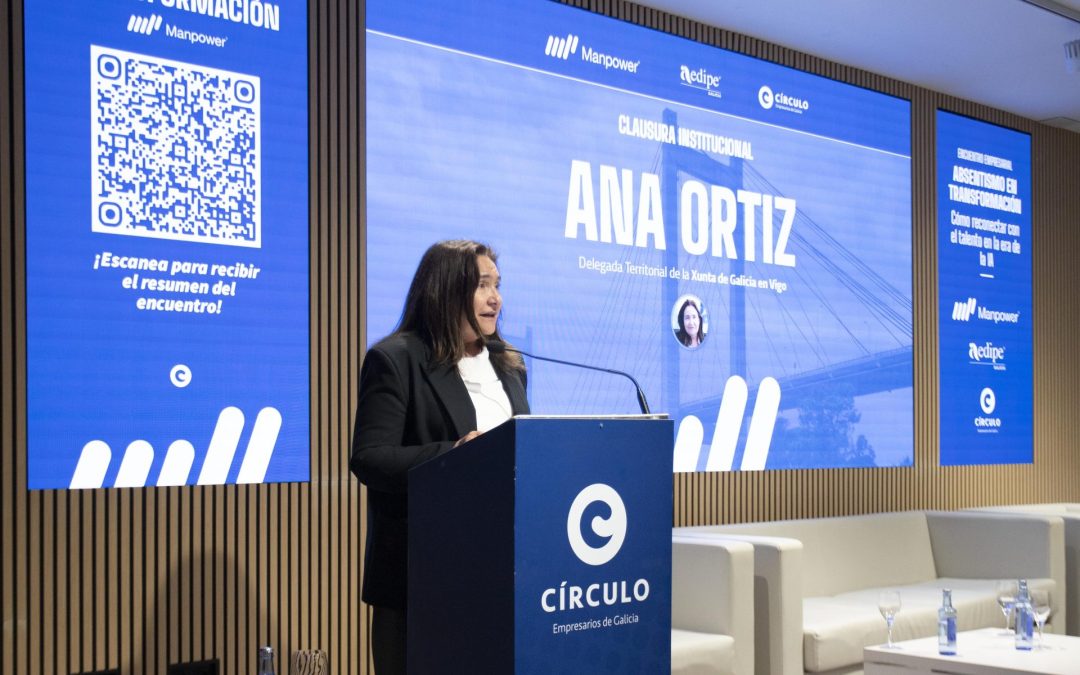A delegada territorial da Xunta de Galicia en Vigo, Ana Ortiz, participou este mércores na clausura do encontro empresarial “Absentismo en transformación” celebrado no Círculo de Empresarios de Galicia. A representante autonómica destacou que Galicia “dá un paso adiante e lidera a procura de solucións a través da política con maiúsculas” e o Diálogo Social como “ferramenta clave”.
