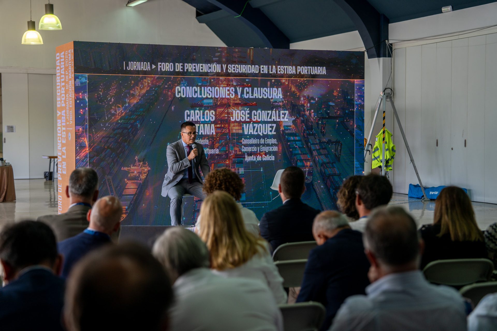 El conselleiro de Emprego, Comercio e Emigración, José González, acompañado por el secretario general de Empleo y Relaciones Laborales, Pablo Fernández, clausuró hoy en Vigo la I Jornada de prevención y seguridad en la estiba portuaria, donde calificó esta actividad de fundamental para un sector, asimismo, crucial para nuestra economía como es el naval. En ese sentido, González apuntó a la necesidad de atajar los riesgos que comporta tanto la estiba como la desestiba, a nivel de seguridad, pero también de carácter ergonómico y psicosocial, al tiempo que puso de relieve la labor de la Xunta en este ámbito en el marco de la Estrategia de Seguridad y Salud en el Trabajo: Horizonte 2027 y de la Mesa técnica del naval.